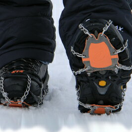 【ヤクトラックス XTR エクストリーム 簡易スノーシュー かんじき [ Sサイズ ]】雪や氷の上は滑りやすくとても危険です、こんなときの必需品がアイス・スノーシューズアタッチメント、ヤクトラックスの簡易スノーシューは高強度の耐摩耗 耐錆性のスパイク チェーンを使用しており、どんな靴底にもワンタッチで装着、簡単に外せます。